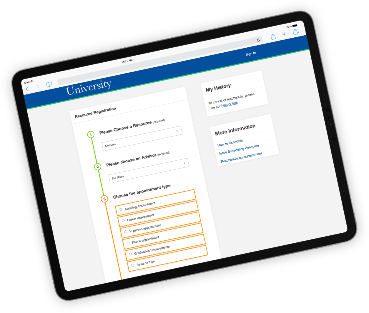 Create scheduling for campus tours, academic advisors, college fairs, and community events so prospective students can get to know your institution.